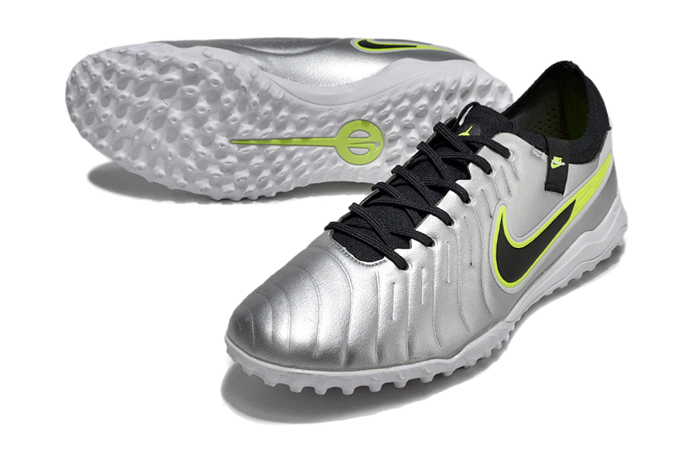 Nike Tiempo Legend 10 Elite TF 'Silver/ Green' — Refinamento nos detalhes, controle em cada passo. Seja o maestro do campo com elegância metálica!